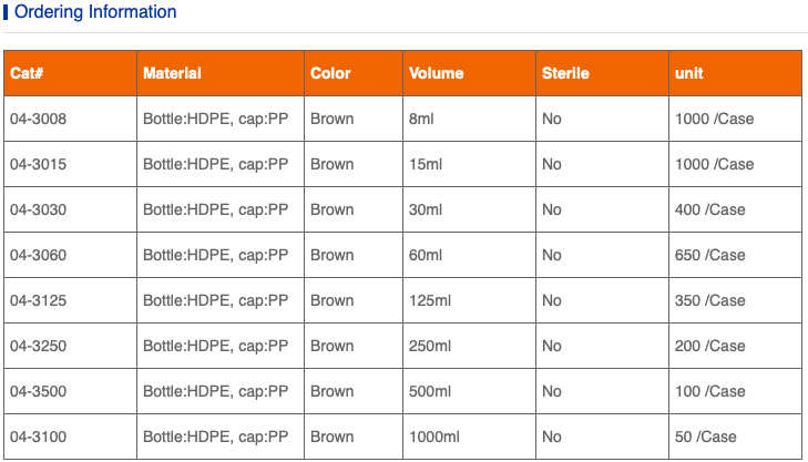 - Chai đựng mẫu mầu nâu, thân chai được làm từ HDPE và nắp làm bằng PP.