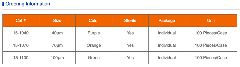 - Màng lọc tế bào lưới nylon vô trùng được mã hoá màu theo kích cỡ lỗ thuận tiện trong sử dụng