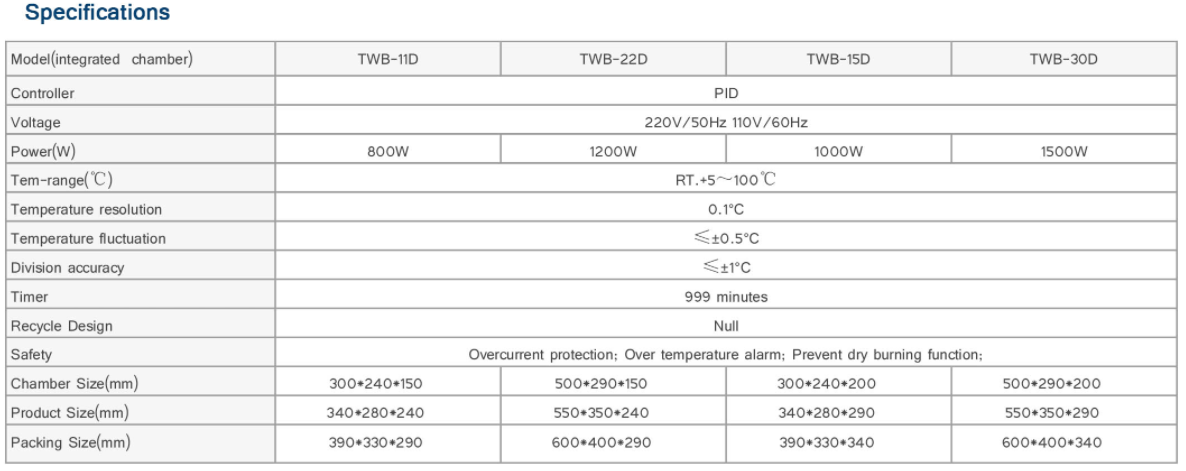 Bể nước dòng TWB là bể nước được sử dụng rộng rãi nhất trong các phòng thí nghiệm. Buồng và nắp đều sử dụng thép không gỉ 304 và có ba lớp bảo vệ an toàn để đảm bảo an toàn cho phòng thí nghiệm. Không gian bên trong sâu hơn bể bình thường và có nắp vòm.