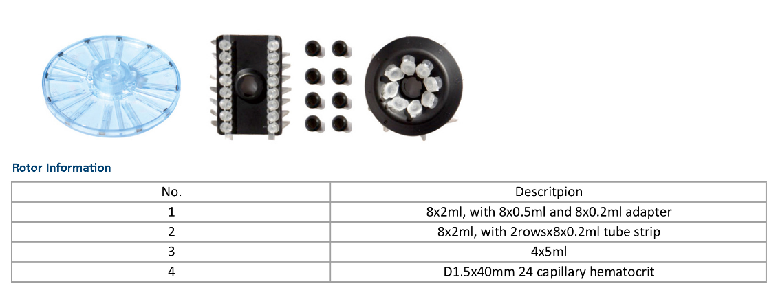 | Rotor | 8x2mL/ 0,5mL/ 0,2mL; 4x5mL; capillary hematocrit rotor | ||||