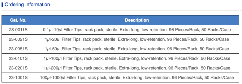 Loại đầu côn siêu dài: 10μl với thể tích tối đa 20μl, 200μl với thể tích tối đa 300μl và 1000μl với thể tích tối đa 1250μl.