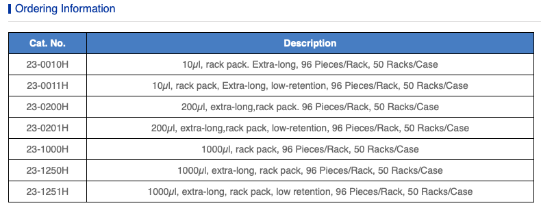 Đầu côn có các kích thước: 10µl, 200µl and 1000µl.