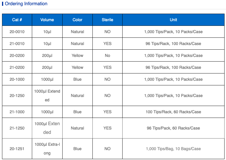 - 10µl and 200µl tips are graduated, 200µl tips have a beveled point design that reduces sample retention