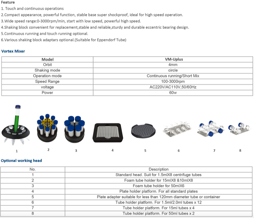 Máy trộn Vortex được sử dụng rộng rãi trong khoa học đời sống và các lĩnh vực phân tích hóa lý, để tái huyền phù mạnh tế bào hoặc viên hóa chất trong ống đến dung tích 15ml.
